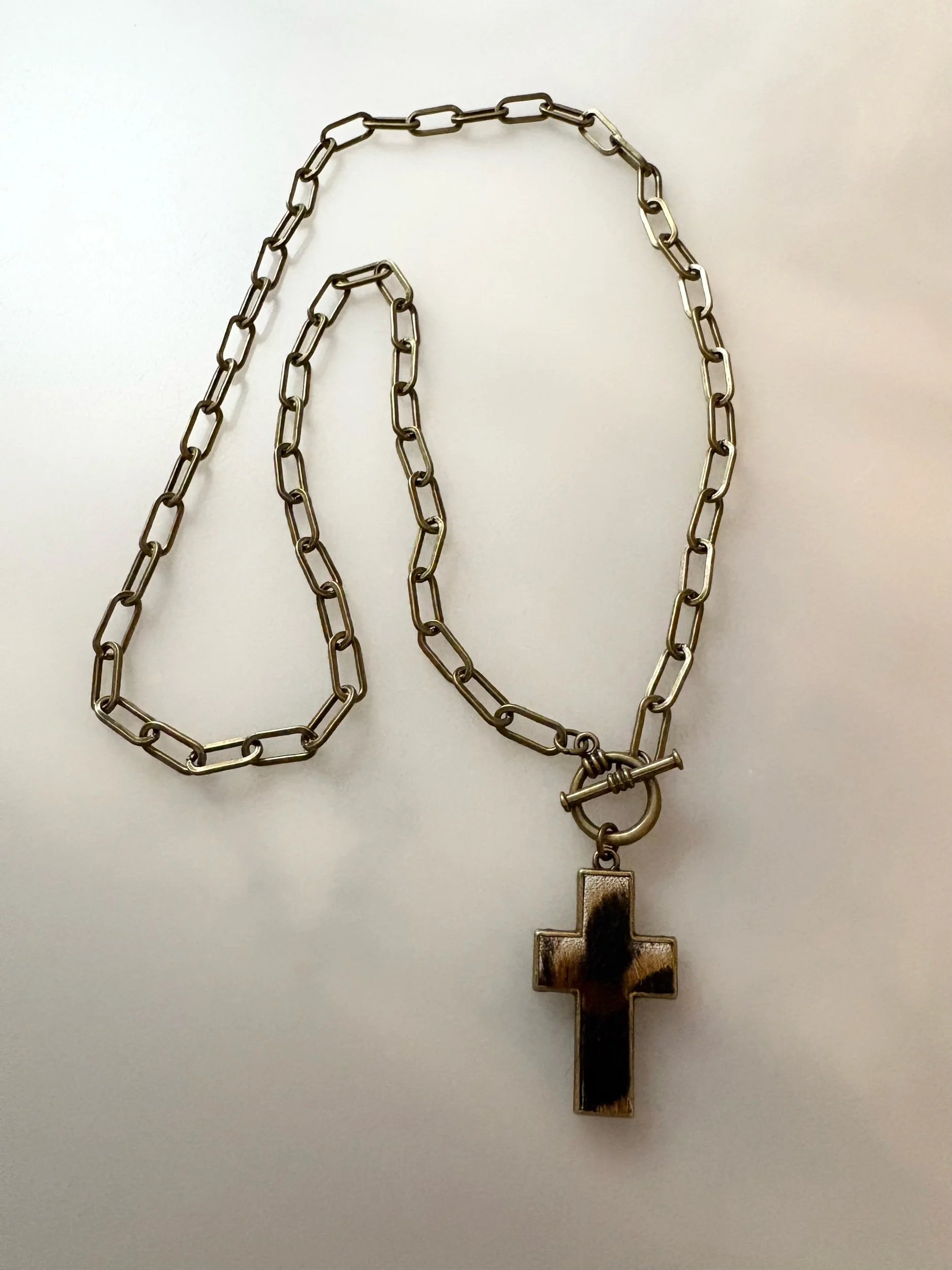 Antiqued Brass / Bronze Color Paperclip Style Link Chain With Cross Pendant