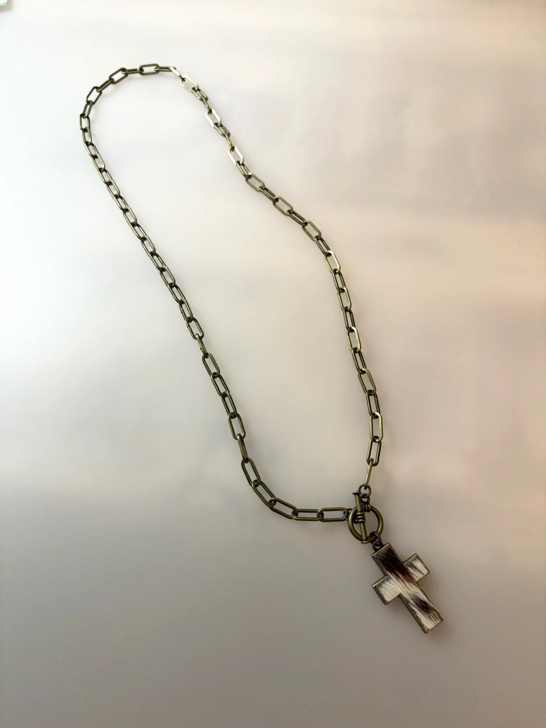 Antiqued Brass / Bronze Color Paperclip Style Link Chain With Cross Pendant