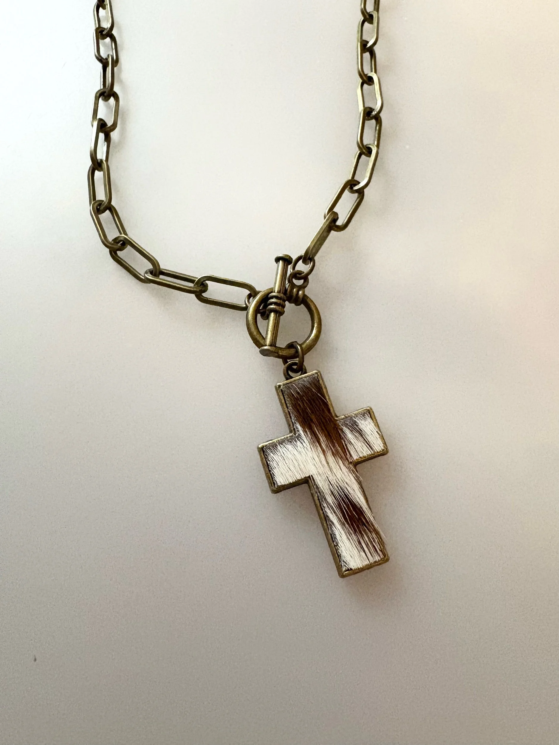 Faith Cross Necklace - Brown & White Spotted Cowhide